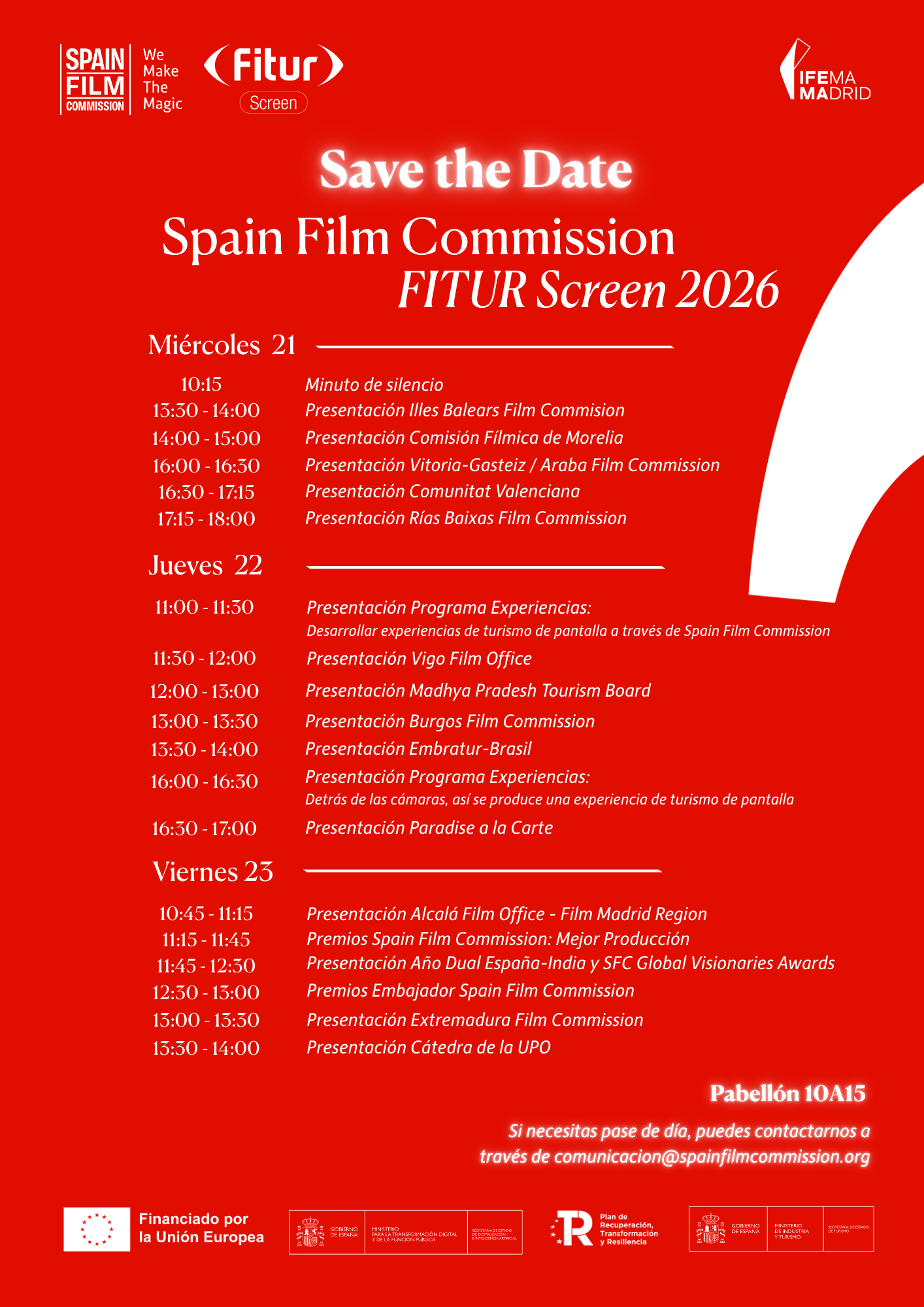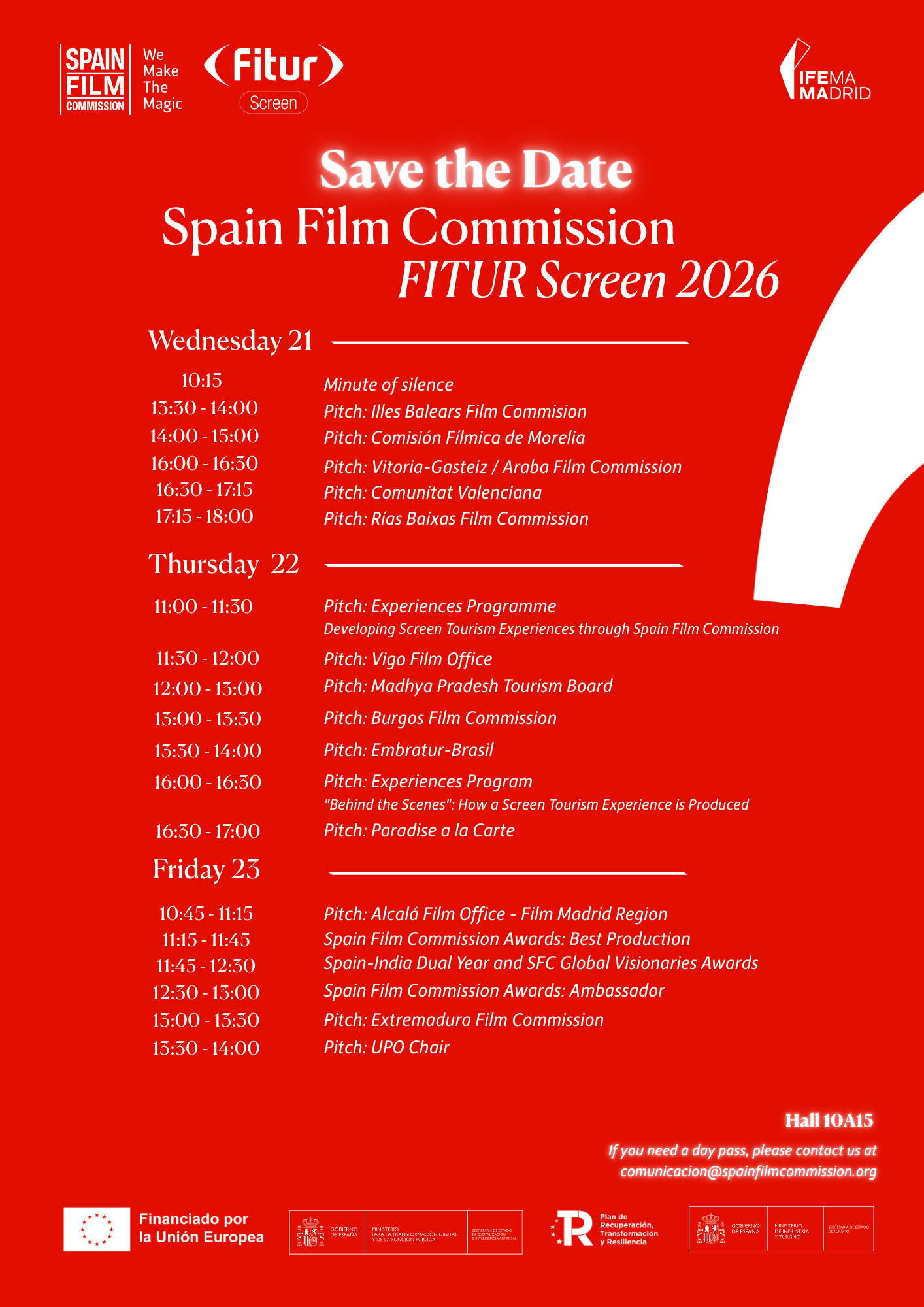 Madrid, 16 de enero de 2026 – Spain Film Commission regresa a FITUR con la octava edición de FITUR Screen, organizada junto con IFEMA, que tendrá lugar del 21 al 23 de enero de 2026 en el Pabellón 10 de IFEMA Madrid. Durante tres días, este espacio reunirá a profesionales nacionales e internacionales del turismo, de la industria audiovisual y también a film commissions y film offices, consolidándose como un punto de encuentro clave para analizar tendencias, explorar oportunidades de negocio y reforzar la colaboración entre destinos y el sector audiovisual.