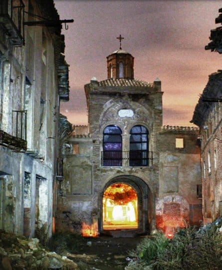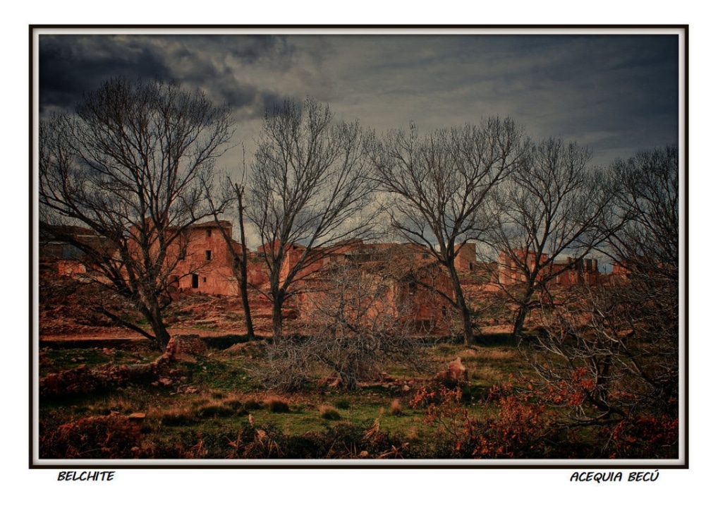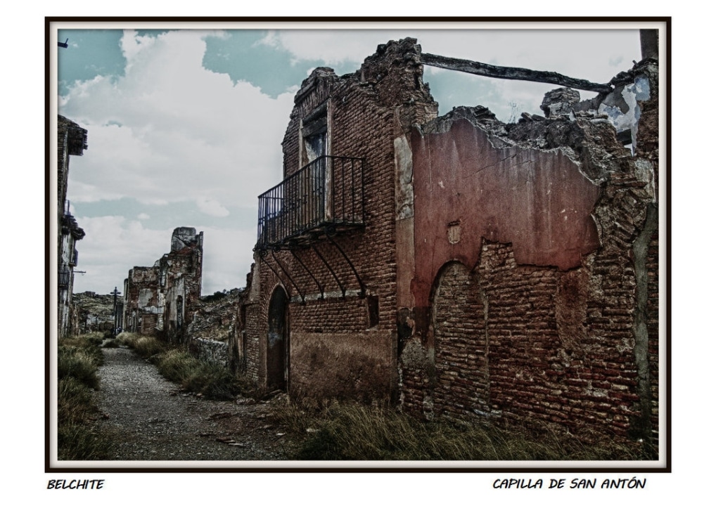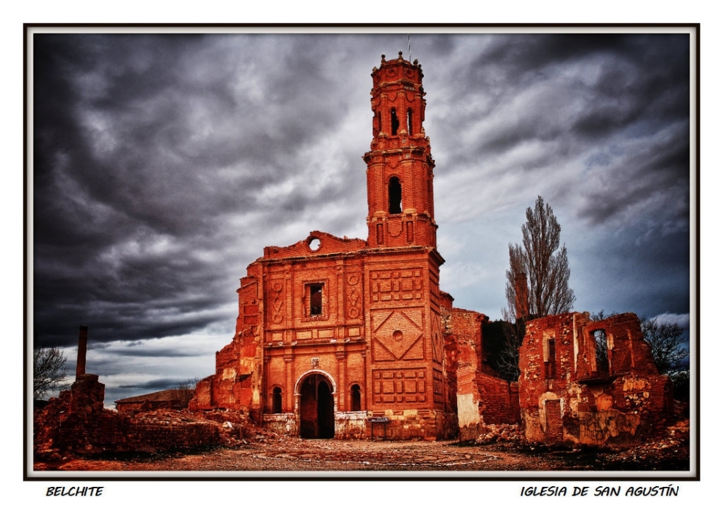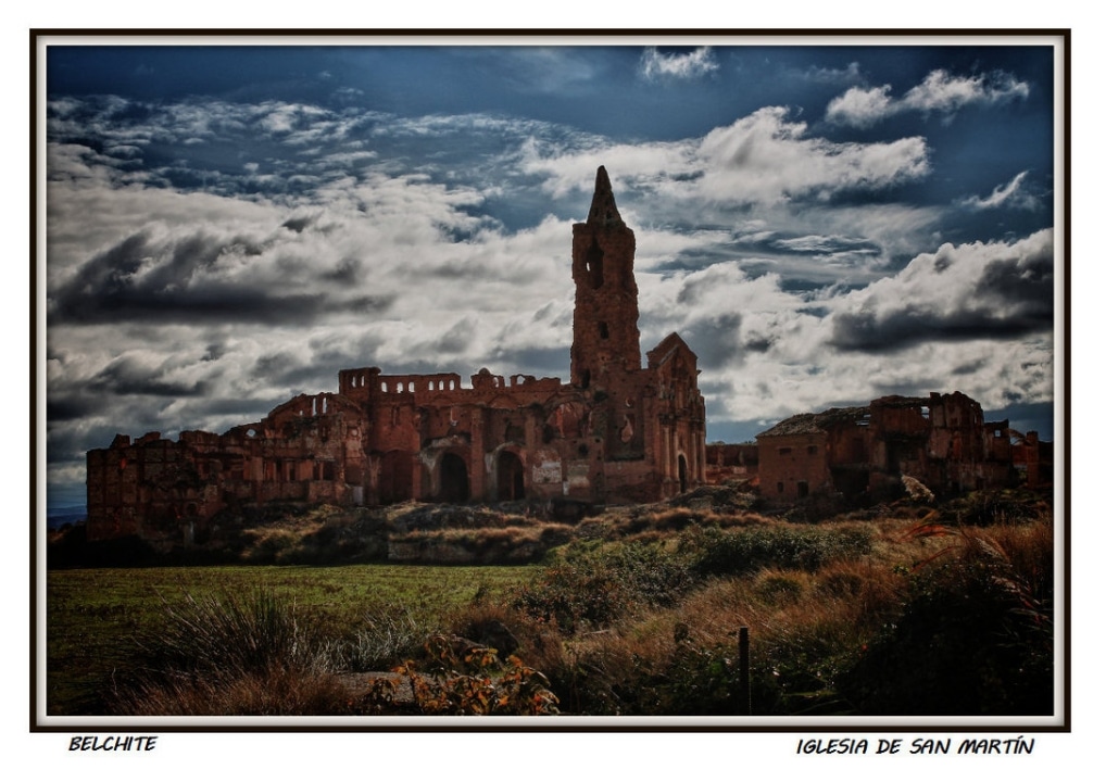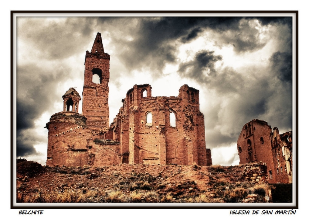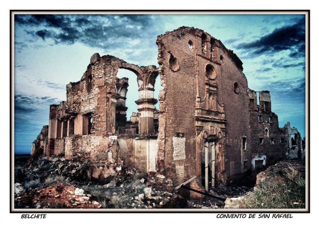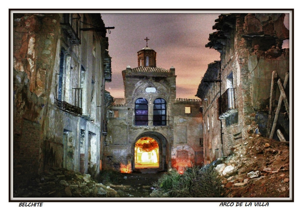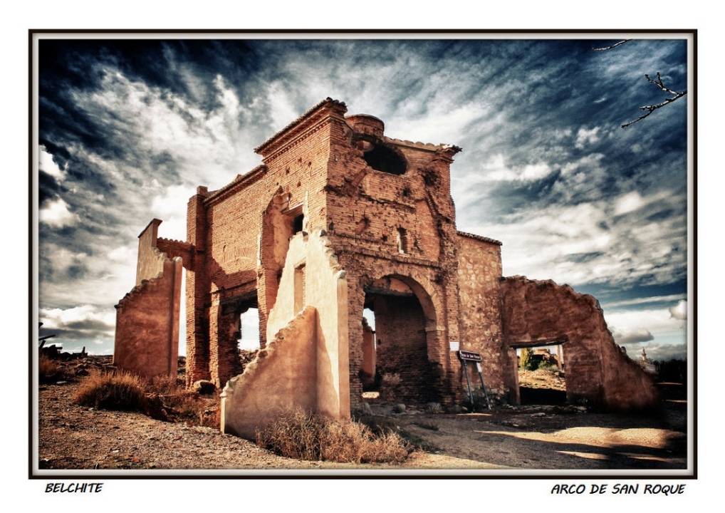 During the 1936 bombings of the Civil War, the town of Belchite (Zaragoza, Aragón) was destroyed, almost completely erased, staying the ruins were left as witness of those bloody years. There are historical ruins of the Moorish population of the 16th-17th centuries, it also preserves the old urban layout and structure of various buildings and churches. The Arco de la Villa, El Arco de San Roque, The Clock Tower, The Church St. Augustine, the convent of San Rafael and the Church of San Martin are noteworthy.
