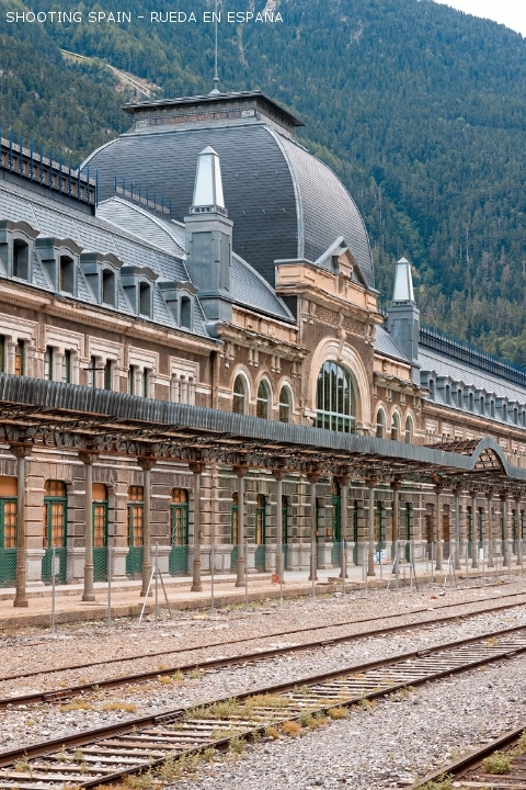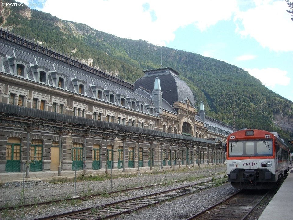 Estación inaugurada en 1928 con aire palaciego francés y con influencias de estilos como el modernista y el art déco. La estructura del edificio se realizó de hormigón armado y tiene un cuerpo central coronado por una cúpula de fundición y cubiertas de pizarra. La enorme estación en Canfranc (Huesca, Aragón), de 240 metros de longitud, cuenta con 75 puertas a cada lado y tres alturas. Está declarada Bien de Interés Cultural. Tras décadas de abandono, se están llevando a cabo diferentes propuestas de rehabilitación de este conjunto histórico.