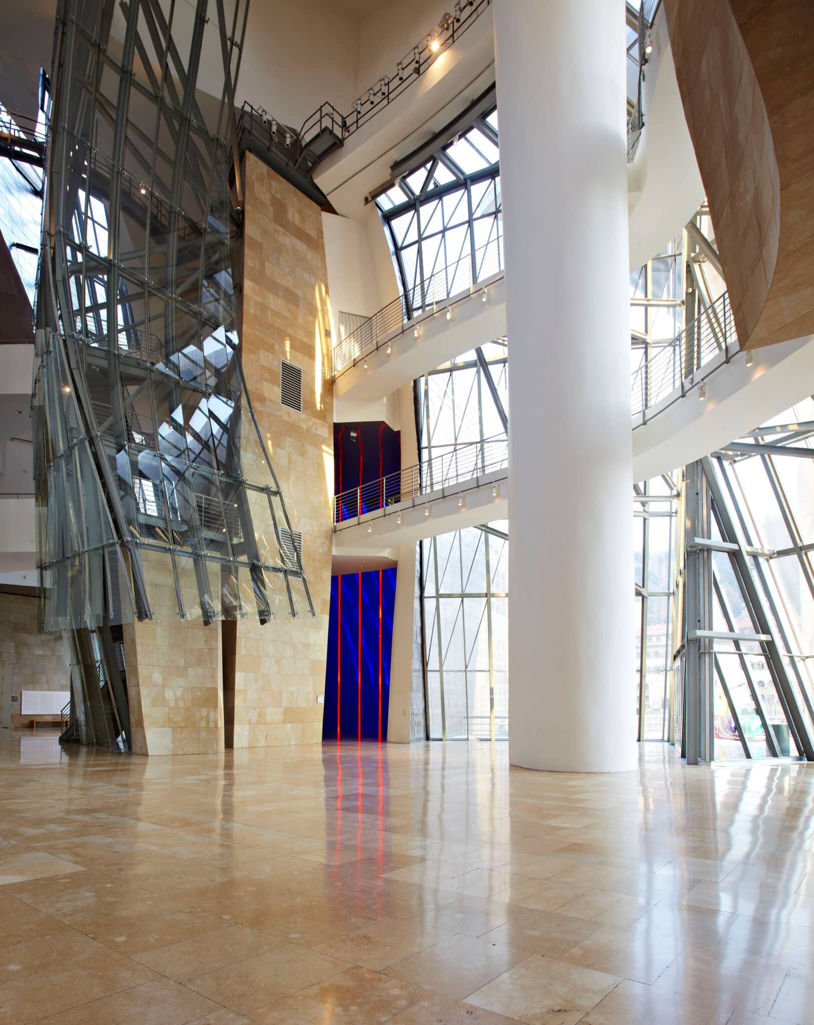 Está constituido por formas curvilíneas y retorcidas, recubiertas de piedra caliza, cortinas de cristal y planchas de titanio. El Museo Guggenheim de Bilbao (Vizcaya, País Vasco), diseñado por Frank O. Gehry, cuenta con una superficie total de 24.000 m², de los cuales 10.540 m² están reservados para las exposiciones de arte contemporáneo, distribuidos en 19 galerías. Desde 2007 está considerado como uno de los 12 Tesoros de España.