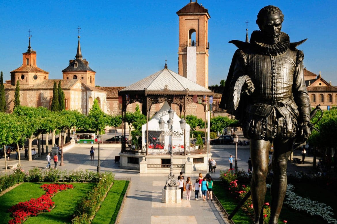 Es uno de los lugares emblemáticos de Alcalá de Henares en el casco histórico.Tiene  forma rectangular y sus lados norte y oeste están soportalados. En la actualidad, la Plaza de Cervantes presenta 72 soportes verticales exentos: 16 son columnas y 56 son pilares de piedra. En el centro de la misma se encuentran paseos y zonas ajardinadas, además de la estatua a Miguel de Cervantes (esculpida por Carlo Nicoli e inaugurada el 9 de octubre de 1879) y el Quiosco de la Música (diseñado por Martín Pastells y construido en 1898).