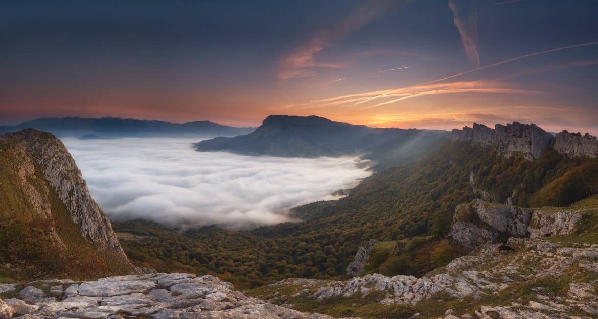 La sierra de Urbasa constituye un gran plano elevado de 1000 metros de altitud que cae en su borde sur creando un espectacular mirador natural. Horadada como un queso Gruyère, en ella encontramos simas y cuevas, pero también extensas praderas en las que pacen ovejas y caballos, hayedos encantados y remansos de agua turquesa como la del Nacedero del Urederra. Recorriendo sus senderos vamos a descubrir restos megalíticos, antiguas fuentes y bordas pastoriles, y en su entorno no dejaremos de visitar el bello monasterio de Irantzu o el singular Museo de la Trufa. Te proponemos un recorrido que atraviesa la sierra de norte a sur.